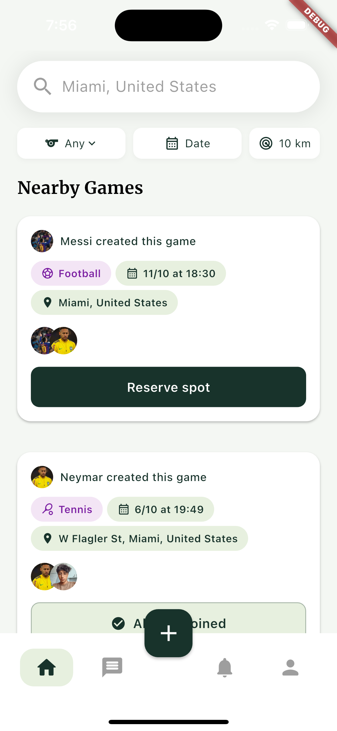 See upcoming games around you and join with a tap. Never play alone again.